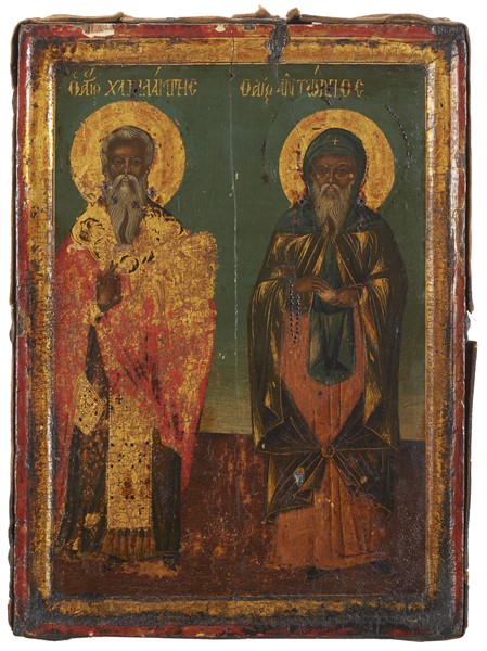 Greek school of the 17th century. Icon tempera on board depicting Saint Clement and Saint Anthony, inscribed at the back (cm 25x19) (defects)