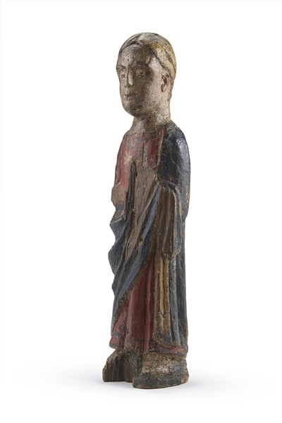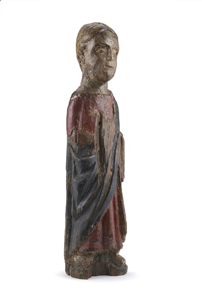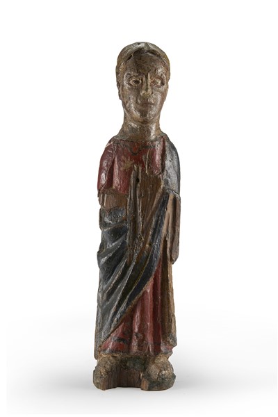 Spanish sculptor (?), 13th-14th century "Apostle (?)" carved wood painted in polychrome (h. cm 40) (defects and losses)