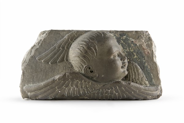 Scultore dell’Italia centrale (Toscana ?), prima metà del secolo XVI. Frammento di un fregio architettonico raffigurante cherubino in pietra, tracce di policromia (cm 31x15x18) (difetti)