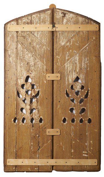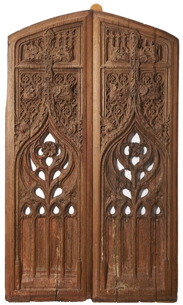 Coppia di scuri per finestre in rovere scolpito e traforato a volute, fiori ed elementi silizzati. Fiandre, secolo XV-XVI (cm 73x124) montati a pannello (difetti)