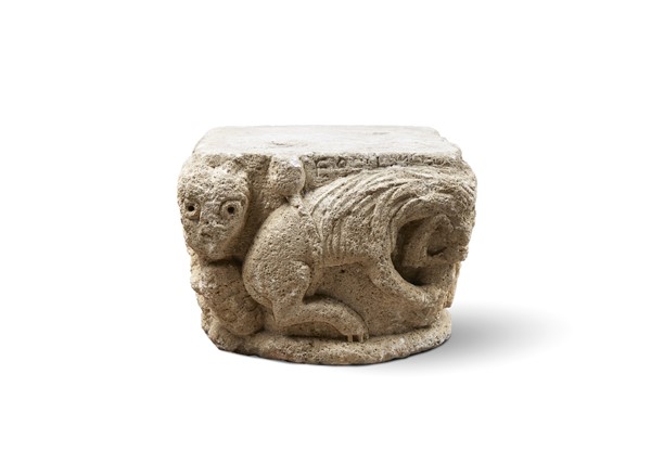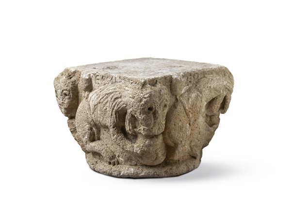 Capitello in pietra scolpita a figure zoomorfe. Francia (?) secolo XI-XII (cm 44x31x43) (difetti)