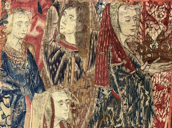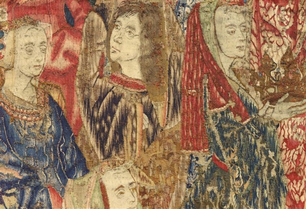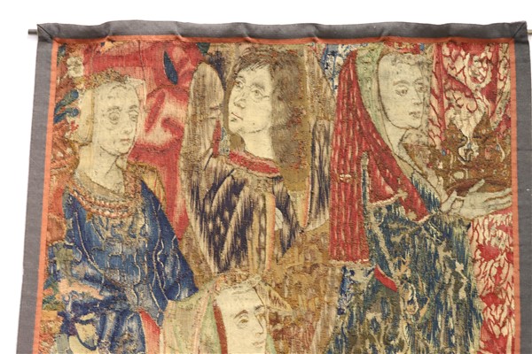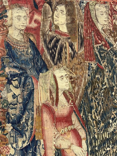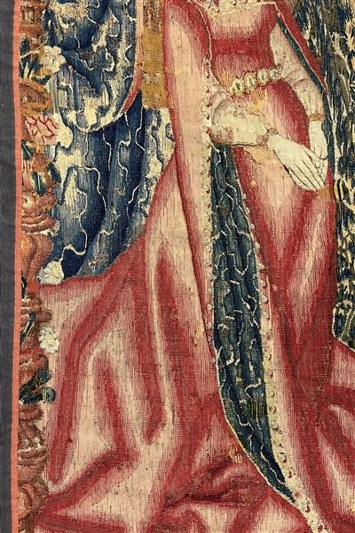 L'arazzo raffigura una possibile scena di incoronazione dove in primo piano si colloca una figura di dama dalle lunghe vesti rosse con le mani giunte ed un velo sul capo, al retro alcune figure di cortigiani con drappi sullo sfondo, a destra si distingue una figura femminile con velo rosso che regge con entrambe le mani una corona, a sinistra è possibile scorgere alcuni elementi di una balaustra.