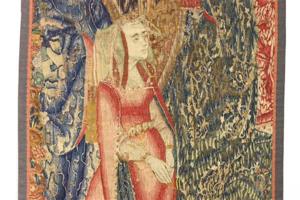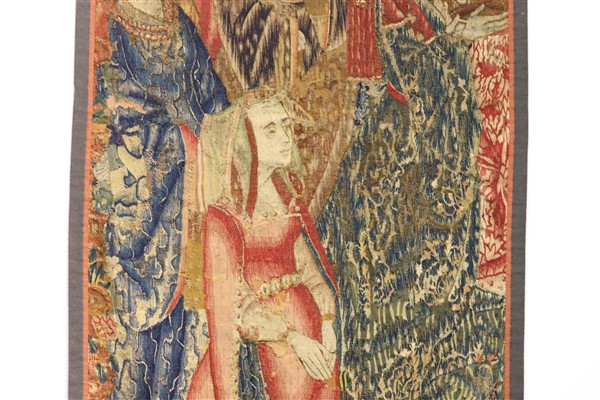 Frammento di arazzo Tournai, Francia, fine secolo XV-inizio XVI. Tessuto a mano in lana (cm 232x113) (difetti e restauri)