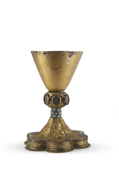 Calice in rame dorato a coppa liscia con fascia decorata a medaglie argentate con scene della vita di Cristo. Base polilobata sbalzata a foglie d'acanto e motivi concatenati. Secolo XV (h. cm 17) (difetti, mancanze e restauri)