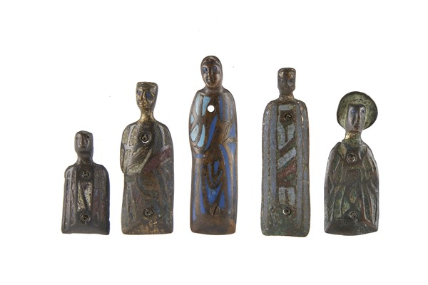 Manifattura di Limoges, secolo XIII. Gruppo di cinque placche in rame con tracce di smalti policromi raffiguranti santi (cm max 8) (difetti)