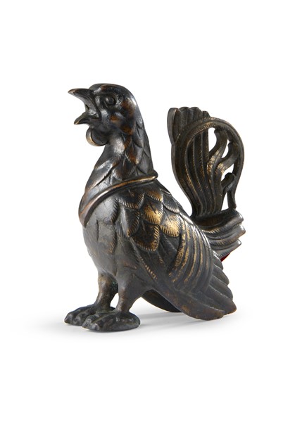 Antico piccolo acquamanile in bronzo in forma di gallo cedrone (h. cm 12) (liev