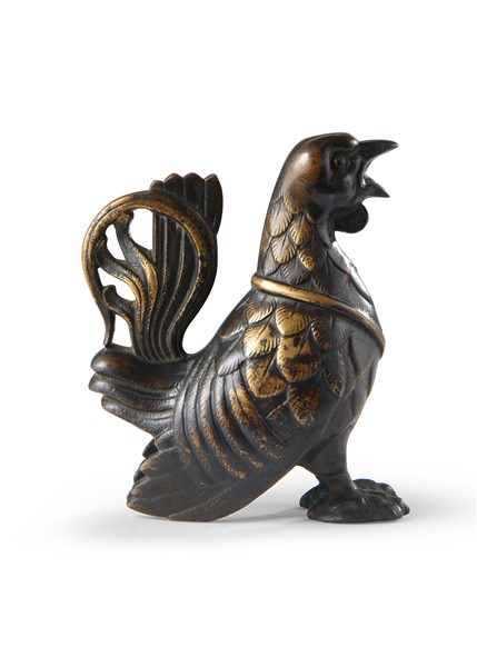 Franco Maria Ricci, Acquamanili: oggetti medievali per uso sacro e profano, fig. 25. This is the model in the shape of a rooster, manufacture of Lower Saxony, mid 13th century, exhibited at the Museum Für Kunsthandwerk, Frankfurt