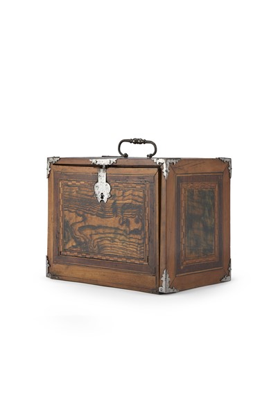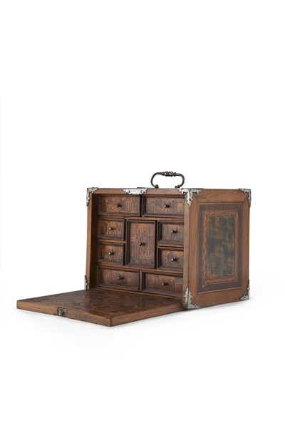 Monetiere da viaggio in legno e radica ad un'anta intarsiata ad elementi architettonici e trionfo con strumenti musicali che rivela otto tiretti intarsiati a paesaggi, profili in ferro. Germania meridionale, secolo XVII (cm 26x21x18) (difetti)