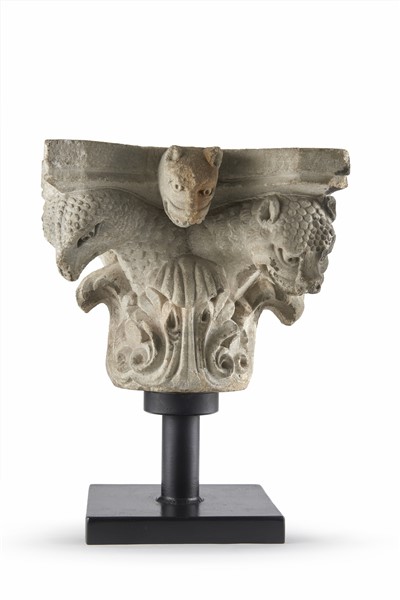 Arte del secolo XII-XIII. Capitello in pietra scolpita a volto a teste di anima