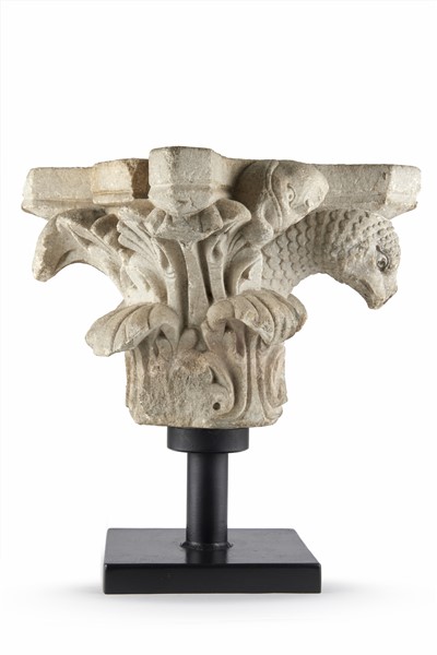 Art of the 12th-13th century. A carved stone capital with animal heads and acanthus leaves (h. cm 23) support and base of later period (defects and small losses)