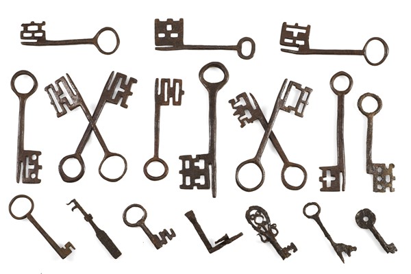 Lotto composto da diciannove diverse antiche chiavi in ferro forgiato e trafora