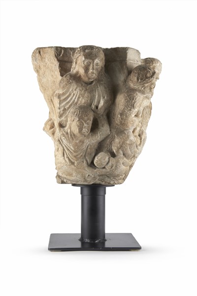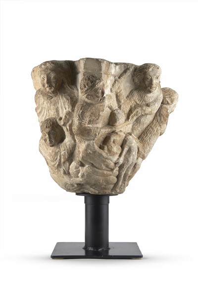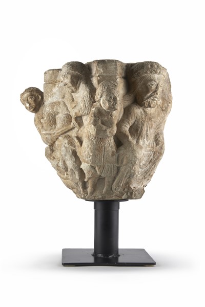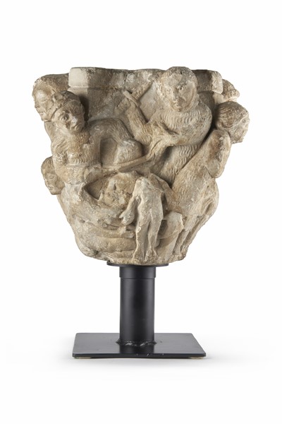Arte del secolo XII-XIII. Capitello in marmo scolpito a figure religiose e guer