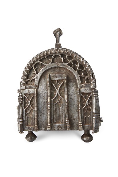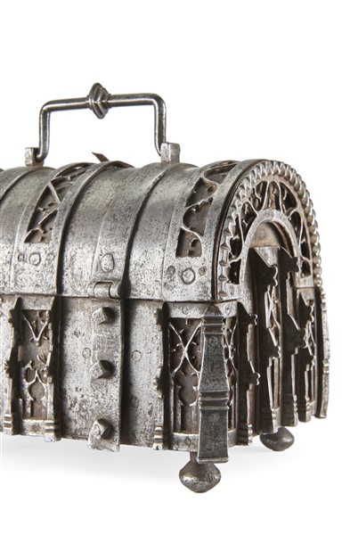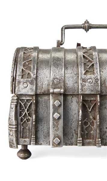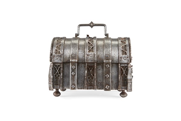 Forziere da viaggio con coperchio a cupola in ferro decorato a volute ed elementi stilizzati e traforati. Francia, secolo XV (cm 20x16x13) (difetti; chiave non coeva)