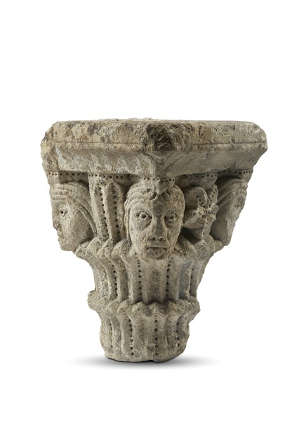 Arte del secolo XI-XII. Capitello in pietra decorato a volti negli angoli tra f