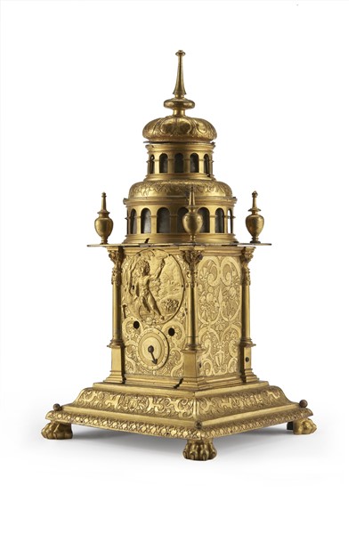 Le colonne laterali sono sormontate da quattro pinnacoli. Le portelle laterali così come le mostre, sono finemente incise a grottesche. Movimento (sostituito) con suoneria su due campanelli. Quadrante (sostituito) a cifre romane. Germania meridionale, prima metà del secolo XVII (h. cm 39) (gravi difetti e sostituzioni)