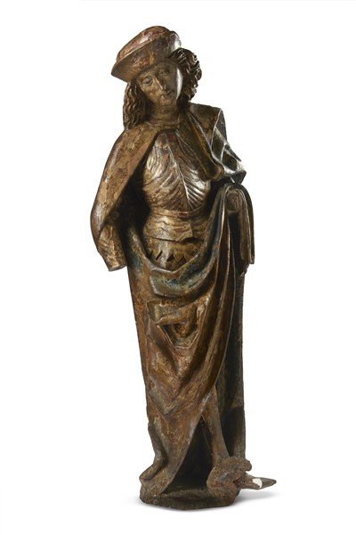 La statua, di grande eleganza e qualità considerevole, raffigurante un giovane santo cavaliere dall’espressione malinconica, forse San Giorgio, che indossa sotto un ampio mantello un petto d’armatura innervato ‘alla tedesca’, è riferibile a un intagliatore austro-bavarese di fine Quattrocento. L’opera, per la scattante postura inarcata con un piede aggettante dalla base, il sottile panneggio franto da pieghe angolose che si arriccia in una ricaduta serpeggiante, i tratti affilati del volto e la fluenza delle chiome, trova efficaci riscontri in alcune statue ricondotte a Erasmus Grasser (Schmidmuhel, 1450 ca. - Monaco 1518), il più noto ed eccentrico intagliatore di questi territori, come il Santo in vesti da medico (Cosma o Damiano ?) del Los Angeles County Museum of Art o il Santo cavaliere, connotato anch’esso da un vistoso cappello, della galleria Sam Fogg di Londra.