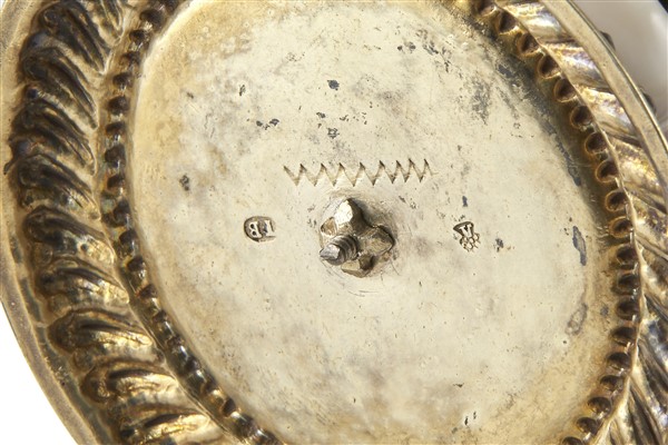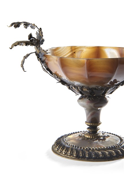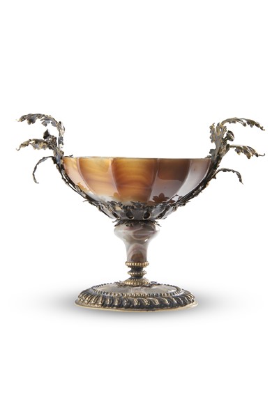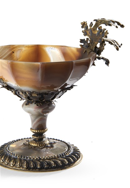 Coppa con corpo in agata costolata, anse e ghiere in vermeil sbalzato e cesellato a foglie, sostegno in agata tornita, base circolare decorata a motivi stilizzati. Asburgo, fine secolo XVII. Argentiere TB (h. cm 12,5x17) (lievi difetti)