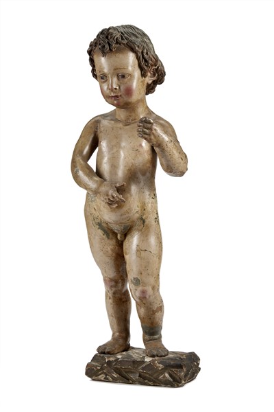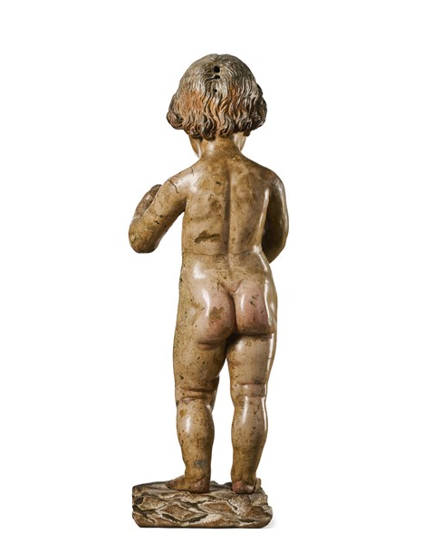 La tipologia e l’iconografia di questa delicata statuetta, raffigurante il Cristo fanciullo che si erge ignudo su una roccia, destinato a ricevere un ampio corredo di vesti pregiate secondo una consuetudine devozionale ben attestata in area mediterranea, così come la particolare tecnica adottata (fusione in piombo dipinta con una sensibile policromia naturalistica), dichiarano che l’opera fu eseguita in Spagna, presumibilmente in Andalusia, dove una tale produzione fu promossa in special modo da Juan Martínez Montañés (Alcalá la Real 1568 - Siviglia 1649), tra i più importanti scultori spagnoli del tempo e principale esponente della scuola sivigliana, interprete di un toccante naturalismo ispirato dai principi della Controriforma. L’opera, nella tenera fisionomia del fanciullo e nella morbida fluenza dei capelli, suggerisce di ricercarne l’autore fra i seguaci del maestro, e osservandone l’articolazione delle braccia - forse concepita per sostenere nella sinistra il calice eucaristico o i simboli della Passione (i chiodi e la corona di spine) -, che si discosta dalla più consueta postura benedicente, è possibile istituire un calzante riscontro con l’esemplare conservato nel Museo della Cattedrale de la Almudena a Madrid (donazione D. Lorenzo Merino), ricondotto alla Scuola Andalusa del primo Seicento e riferito in modo propositivo a Juan de la Mesa (Cordova 1583 - Siviglia 1627), principale discepolo del Montañés incline a declinarne l’ascendente manierista con una maggiore fluenza barocca.