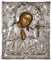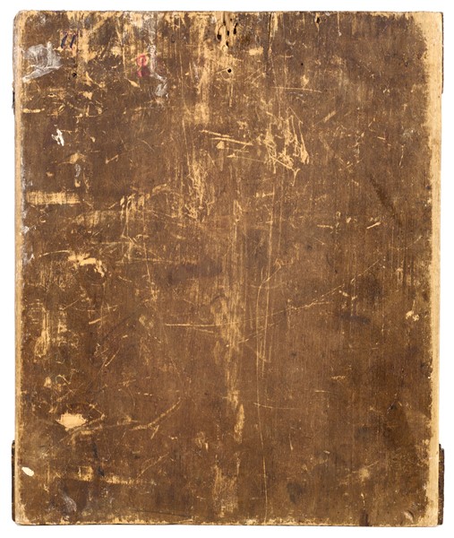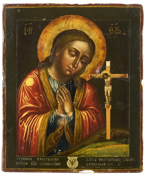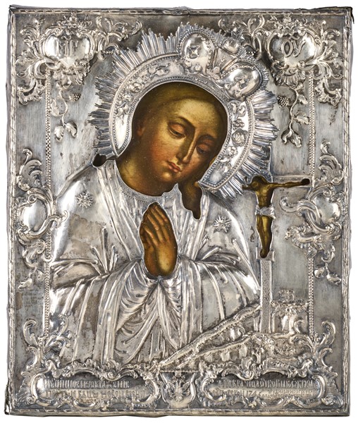 Una rara icona a tempera su tavola raffigurante la Madre di Dio Akhtyrskaya (Madonna di Akhtyr) in preghiera che contempla il Cristo crocifisso, all'interno della sua riza d'argento incisa e sbalzata (84 zolotniki) con iscrizione cirillica sul bordo inferiore: « la vera rappresentazione e misura della miracolosa icona Akhtyrskaya della Madre di Dio dell'anno 1745 », quindi firmata e datata « Dipinta dall'isografo Johan Feodorovich Rojnov il 13 agosto 1748 », con un medaglione centrale dell'aquila bicipite imperiale dei Romanov.. Provincia russa, circa 1748.Argentiere: BP in cirillico, non identificato (cm 26x31) (difetti; mancanze e restauri alla tavola)