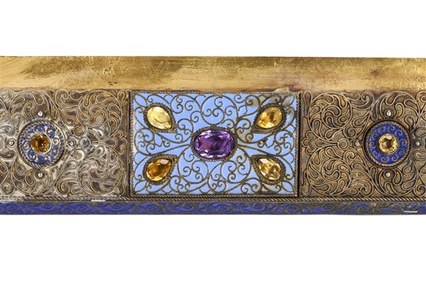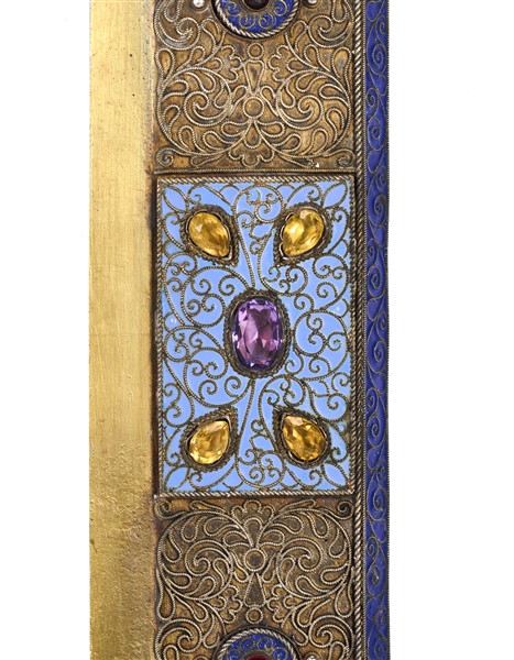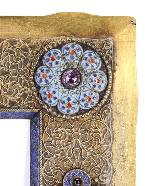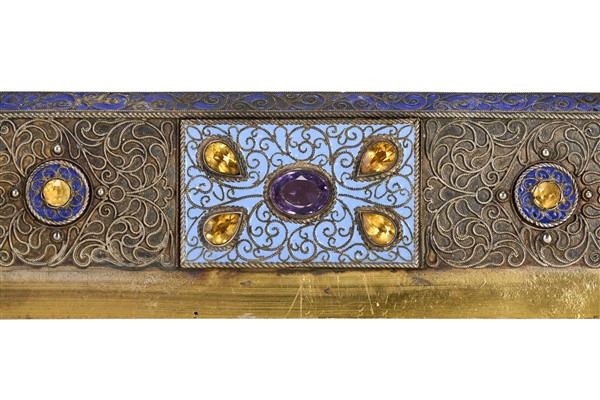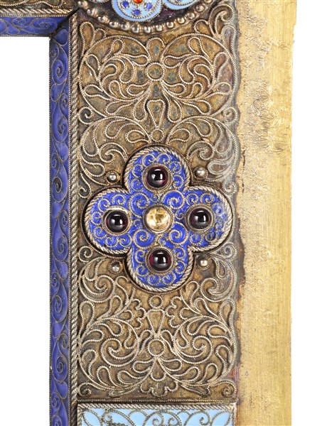 Russian art, 20th century. An important tempera icon on panel depicting Saint George slaying the Dragon within its silver-gilt gem-set basma (84 zolotniki), ornate with silver filigree, polychrome cloisonné enamel, amethysts, citrine quartz, garnet cabochons and colored glass paste. Moscow, 1908-1917. Silversmith : Pavel OVCHINNIKOV, with mark of Supplier of the Imperial Court (cm 27x31) (defects; losses and restorations at the table)