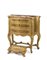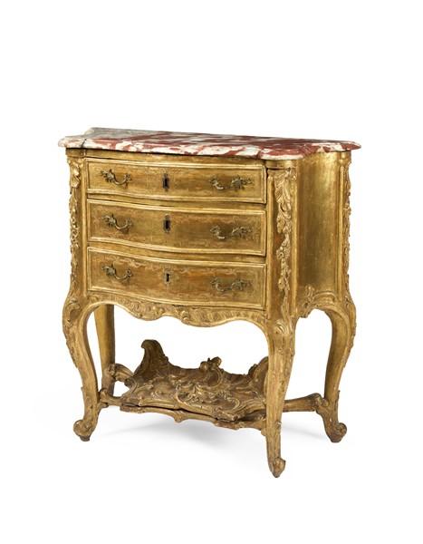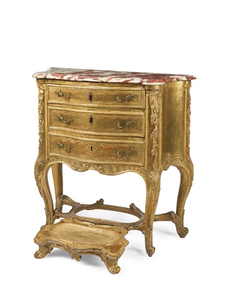 Comoncino con inginocchiatoio in legno intagliato e dorato, fronte mosso a tre cassetti e gambe raccordate da predellino ribaltabile. Piano sagomato in marmo. Secolo XVIII (cm 80x86x37) (difetti e restauri)