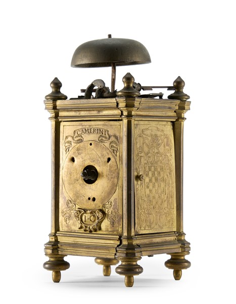 Orologio a lanterna in ottone di forma parallelepipeda con montanti angolari a pianta esagonale, piedini e pinnacoli torniti. La cassa, finemente incisa su tre lati, è composta da una mostra recante un cartiglio con il nome di "Camerini", il monogramma "I-C" e la data 1667. Il quadrante (mancante) doveva essere a disco argentato con cifre romane. Le portelle laterali raffigurano entrambe lo stesso stemma vescovile scaccato. Movimento a due treni con suoneria delle ore su campanello tramite sistema a ruota partiore. Scappamento a verga (meccanismo della sveglia mancante) (h. cm 17) (gravi difetti e mancanze)
