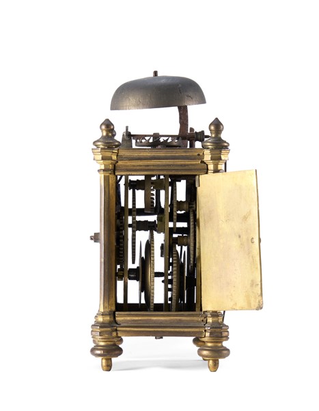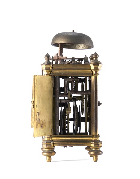 Brass lantern clock. Cartouche with the name "Camerini", the monogram "I-C" and the date 1667 on the watch case. The dial (missing) must have been a silvered disk with Roman numerals. Two-train movement with chime of the hours on a bell (missing alarm mechanism) (h. cm 17) (serious defects and losses)