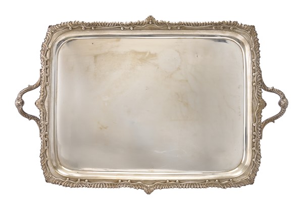 Vassoio biansato in argento con bordure a foglie e anse centrate da testa leonina. Londra, 1896. Argentiere Hawksworth, Eyre & Co Ltd (cm 73x46,5) (g 3550) (lievi difetti)