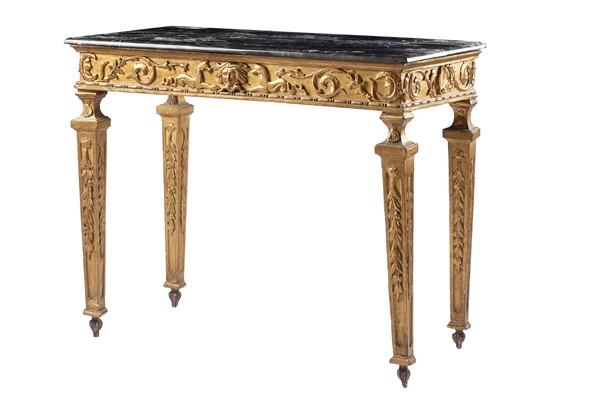 Tavolo da parete in legno intagliato e dorato, fascia centrata da volto di Medusa tra creature fantastiche, girali di foglie e fiori e valva di conchiglia, gambe ad obelisco rovesciato, piano in marmo portoro. Centro Italia, secolo XIX (cm 114x89x56) (difetti)