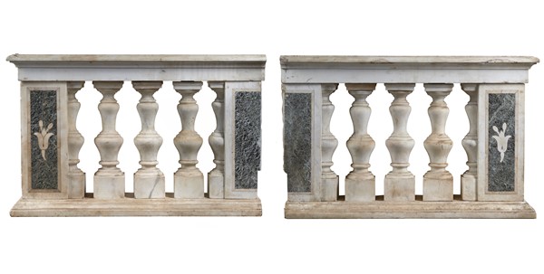 Due balaustre in marmo bianco con piano aggettante, colonne tornite, montanti a pilastro con specchiature in marmo verde Alpi. Secolo XVIII (cm 116x74x24) (difetti)