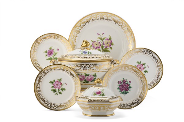 Manifattura francese, secolo XIX. Parte di servizio in porcellana policroma decorata con motivi floreali e naturalistici, profili dorati, prese dei coperchi in forma di frutto, composto da: legumiera ottagonale con coperchio, due piatti piani, due piatti fondi, zuppiera ovale, un piatto tondo da portata (d. max cm 38) (difetti)