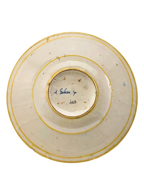 Bottega dei Fontana, Urbino, 1560-1570. Piatto in maiolica istoriata dipinta in policromia con Galatea e il trionfo di Amore entro paesaggio marino. Al verso iscrizione "Galatea" in blu (d. cm 31) (lievi difetti)