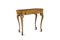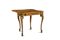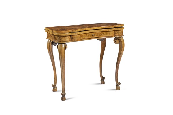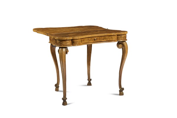 Tavolino da gioco lastronato in noce e radica di noce, intarsiato e filettato in legni vari, piano apribile, cassetto nella fascia, alte gambe in massello intagliato a voluta terminante a ricciolo su piede a zoccolo. Emilia, secolo XVIII (cm chiuso 87x76x43) (difetti e restauri)