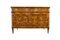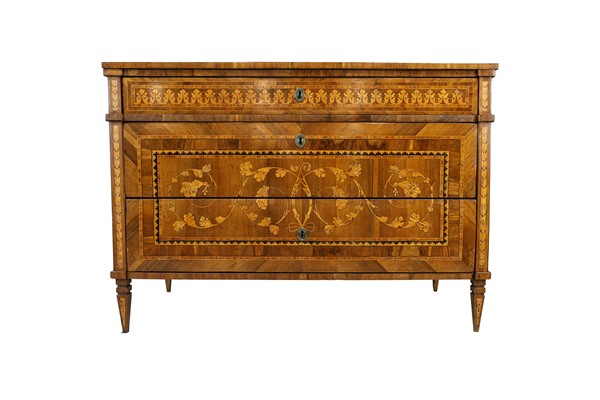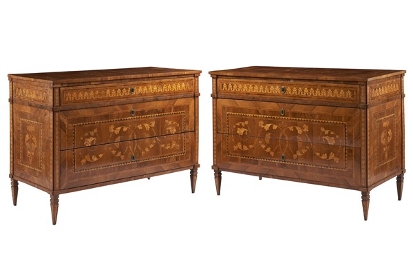 Coppia di cassettoni a due cassetti e mezzo sottopiano. Fronte, fianchi e piano lastronati e riccamente intarsiati a volute e foglie in legni vari. Gambe rastremate. Lombardia, inizio secolo XIX (cm 126x99x55,5) (difetti e restauri)