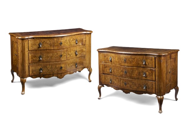 Coppia di cassettoni di forma mossa lastronati in noce e radica di noce con tre cassetti sul fronte, due sportelli laterali, gambe mosse, fregi in bronzo. Veneto, secolo XVIII (cm 149x95x68; cm 147x95x68) (difetti, restauri e mancanze)