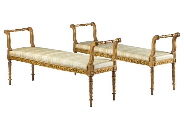 Coppia di panchetti in legno intagliato e dorato, braccioli a ricciolo scanalati e perlinati, fasce e gambe a spirale decorate da foglie di vite. Roma, secolo XVIII (cm 160x68) (difetti e restauri)