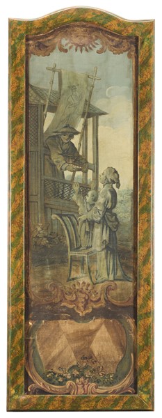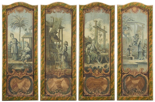 Venetian art of the 18th century. Group of four panels tempera on canvas with decoration in chinoiserie with lacquered frames in imitation marble (cm tot 160x58) (defects and restorations)