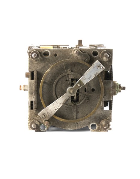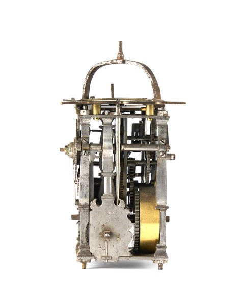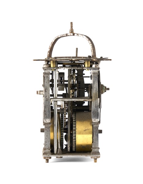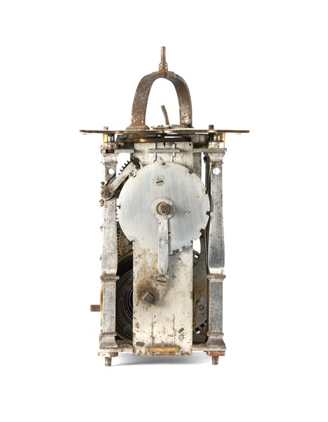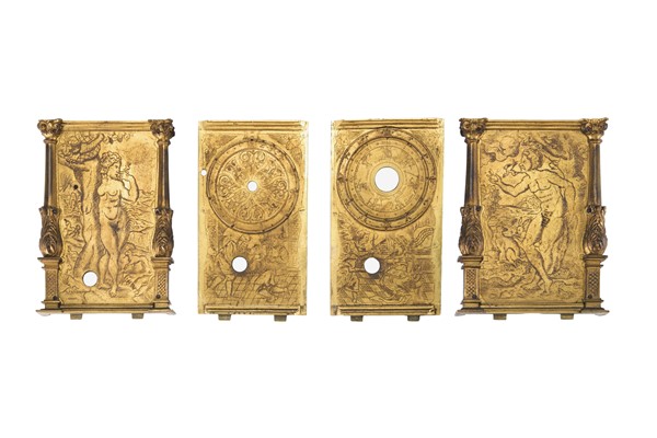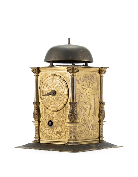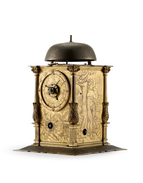 Orologio a edicola in ottone e rame dorato. Cassa finemente incisa a motivi biblici con angolari in foggia di colonne. Movimento a due treni più sveglia in ferro con montanti angolari a base quadrata e suoneria delle ore su campanello tramite ruota partiore. Scappamento a verga e bilanciere. Il quadrante anteriore presenta un anello esterno con doppia divisione dei minuti a cifre arabe ogni 5 minuti e quattro quarti in cifre romane. Nell’anello subito più interno è presente il cerchio delle ore in 12 a cifre romane. Nella fascia interna a seguire, sono indicati alcuni astri del Sistema Solare. Partendo dalle ore 12 sono così indicati in senso orario: Sole, Luna, Marte, Mercurio, Giove, Venere e Saturno seguiti più internamente dai giorni della settimana in tedesco. Nella parte più interna è presente il disco della sveglia. Il quadrante posteriore, a singola fascia, segna l’avanzamento della suoneria in 12. Germania meridionale, XVI secolo (h. cm 16) (difetti e mancanze)