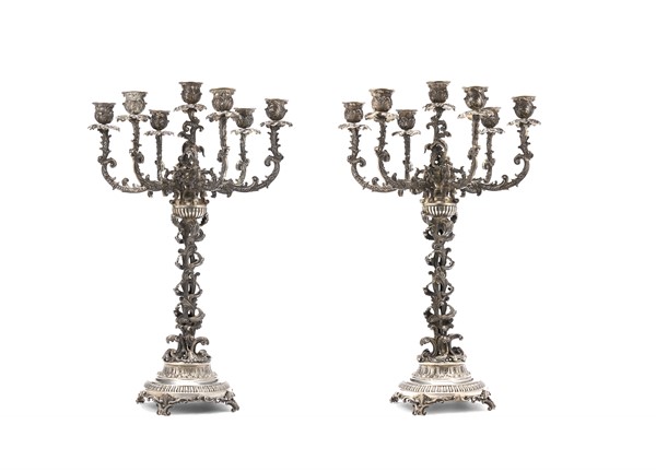 Coppia di candelabri a cinque fiamme in argento con reggi candele sagomati e decorati a elementi vegetali. Fusto a "ramage" di volute fogliate poggianti su basi circolari sbalzate a foglie d'acanto e motivi stilizzati, piedini a rocailles. Milano, Argentiere Danilo Rossi (g 7400) (h. cm 58) (lievi difetti)
