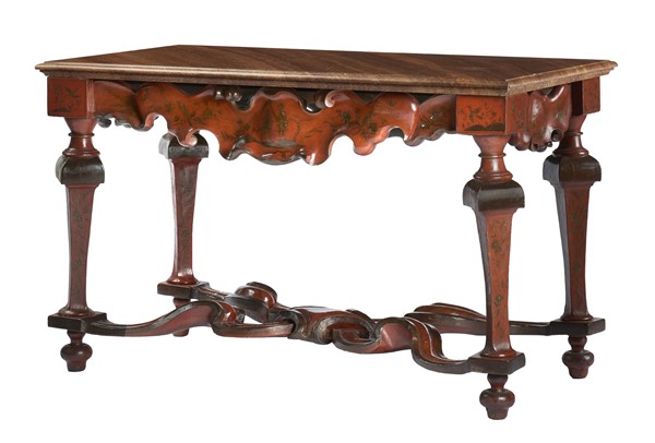 Tavolo da centro in legno laccato rosso ruggine e dipinto con decori a chinoiserie, fascia sagomata a festone, gambe a obelisco rovesciato riunite da crociera a doppia voluta, piedi a cipolla e piano in granito rosso non pertinente. Roma, secolo XVIII (cm 141x84x70) (difetti e restauri)