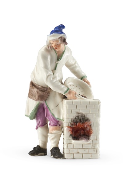 "Venditore di castagne" modellato da Giuseppe Gricci (Firenze 1719 - Madrid 1771), raffigurato in piedi con in mano un cesto traforato con castagne sul fuoco, le fiamme che escono dal forno, indossa un berretto blu e pantaloni prugna (h. cm 12) (difetto di cottura e piccoli difetti)
