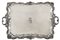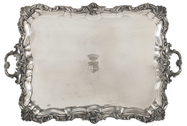 Grande vassoio biansato in argento a profilo mistilineo e decorato da volute e motivi rocaille, piano liscio centrato da stemma araldico della Famiglia Mirafiori (Emanuele Guerrieri di Mirafiori). Milano, secolo XIX. Argentiere Angelo Garavaglia. (cm 109x74) (g 12500) (lievi difetti)