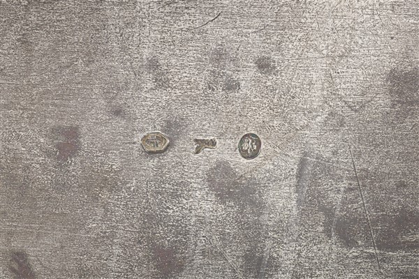 Large silver tray, smooth top centered by heraldic coat of arms of the Mirafiori family (Emanuele Guerrieri di Mirafiori). Milan, 19th century. Silversmith Angelo Garavaglia. (cm 109x74) (g 12500) (slight defects)