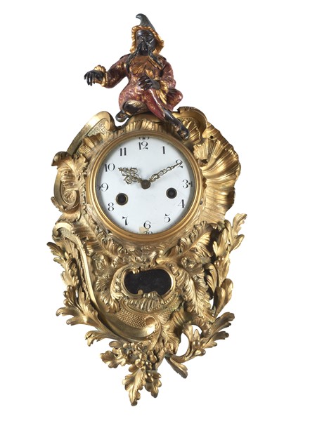 Orologio da parete del tipo Cartel d'applique in bronzo dorato e laccato con decoro "au chinois" e volute di gusto roccailles. Quadrante in smalto bianco a cifre arabe. Movimento a due treni con suoneria delle ore e mezze su campanello. Francia, metà secolo XVIII (h. 57 cm) (difetti e quadrante sostituito)
