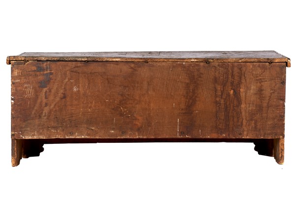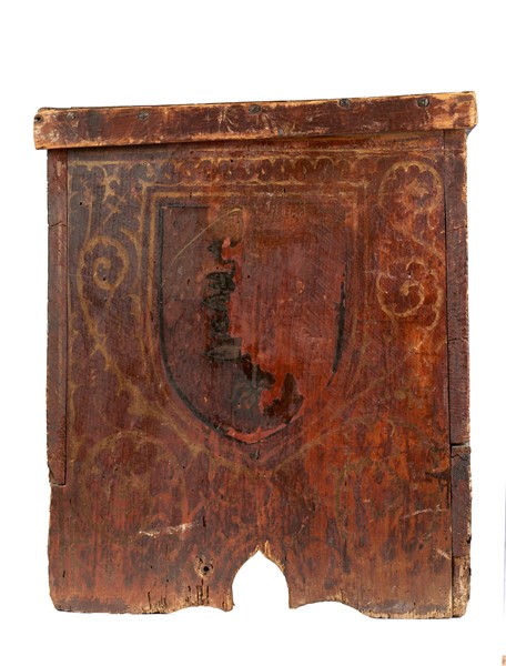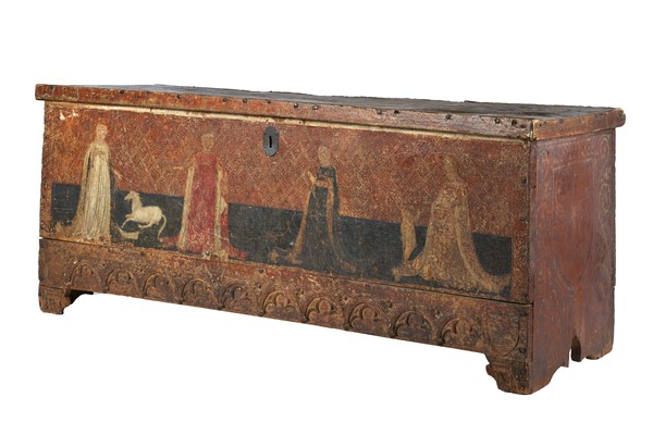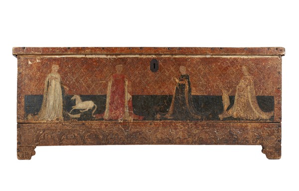 Cassone nuziale in legno dorato, fronte dipinto a tempera con quattro figure incoronate a carattere religioso, balza ad archetti pensili in basso, fianchi decorati da stemma araldico. Lombardia, secolo XV (cm 195x81x67) (difetti e perdite alla decorazione pittorica)