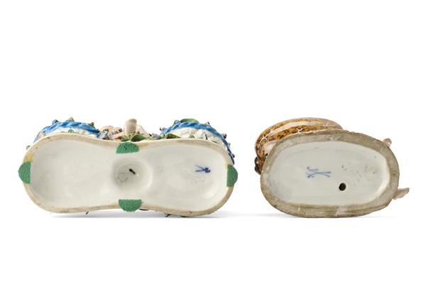 Manifattura di Meissen, secolo XIX-XX. Due centrotavola in porcellana policroma raffiguranti rispettivamente putto con fiori tra due cestini di vimini traforati e fanciullo appoggiato ad una conchiglia (cm max 18x16) (difetti)