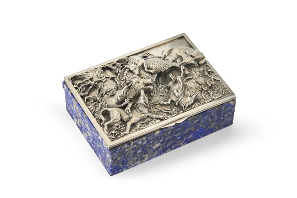 Scatola lastronata in lapislazzuli con ghiera e coperchio in argento in fusione a scena di caccia al cinghiale. Milano, argentiere A.Vallin (g netti 390) (cm 12x4,5x9,5) (difetti)