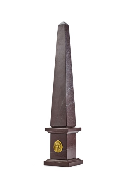 Obelisco in marmo rosso su base a plinto. Fronte con mascherone in bronzo dorato applicato (h. cm 51) (lievi difetti)
