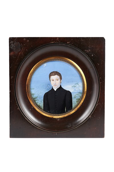 Maestro del secolo XIX. "Ritratto di gentiluomo in un paesaggio" miniatura tond