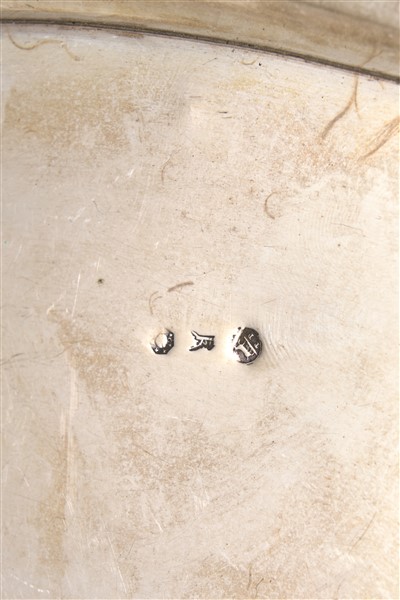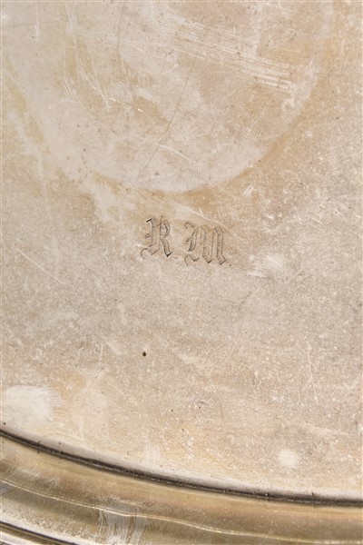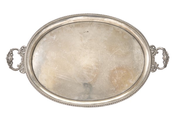 Vassoio in argento di forma ovale biansato con bordo cesellato e anse a volute contrapposte. Milano, secolo XIX. Argentiere Tommaso Panizza (cm 49x30) (g 900) (difetti)